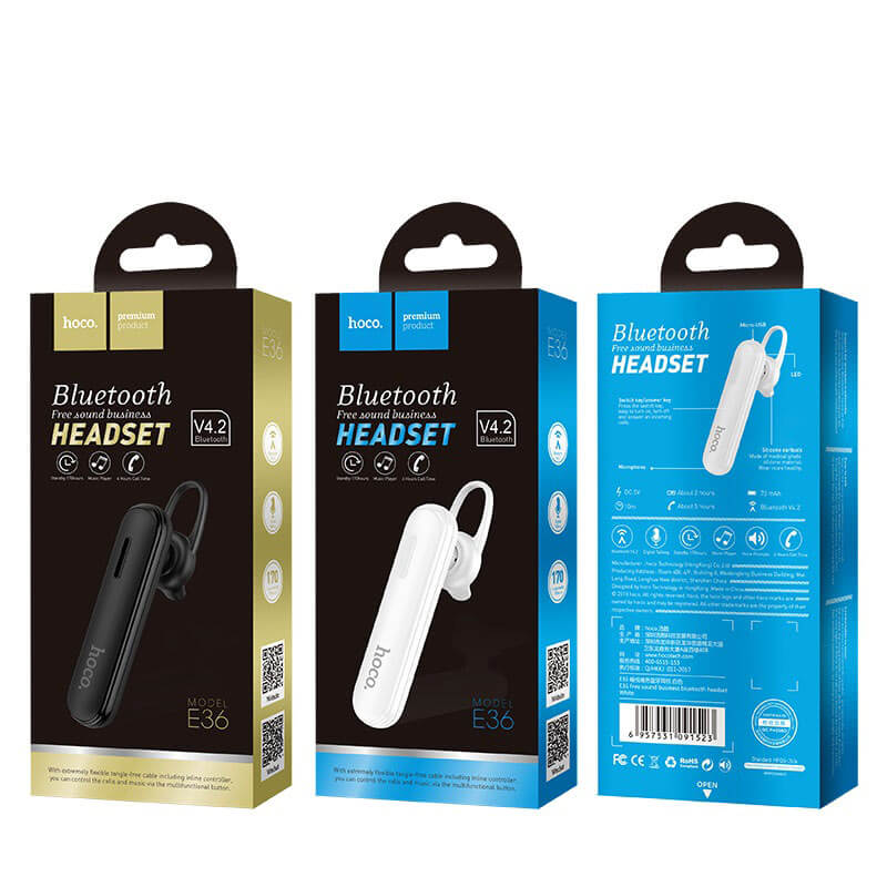 هندزفری بلوتوثی هوکو E36 طراحی بسیار جذابی دارد و در دو رنگ مشکی و سفید تولید شده است. ما با یک هندزفری بلند و کشیده که ظاهر ناخوشایندی داشته باشد، روبه‌رو نیستیم و مهندسان سعی کرده‌اند تعادل را در طراحی حفظ کنند. یک دکمه باریک و بلند روی بخش جلویی قرار گرفته است که به کمک آن می‌توان تماس‌های تلفنی و موسیقی در حال پخش را مدیریت کرد. نشانگر LED بالاتر از این کلید قرار گرفته و وضعیت اتصال هندزفری به سایر دستگاه‌ها را نشان می‌دهد. در قسمت بالایی نیز پورت microUSB تعبیه شده تا بتوان از طریق آن، دستگاه را شارژ کرد. جالب است بدانید که این هندزفری تنها 7 گرم وزن دارد و به هیچ‌وجه باعث خستگی گوش یا سر شما نمی‌شود.