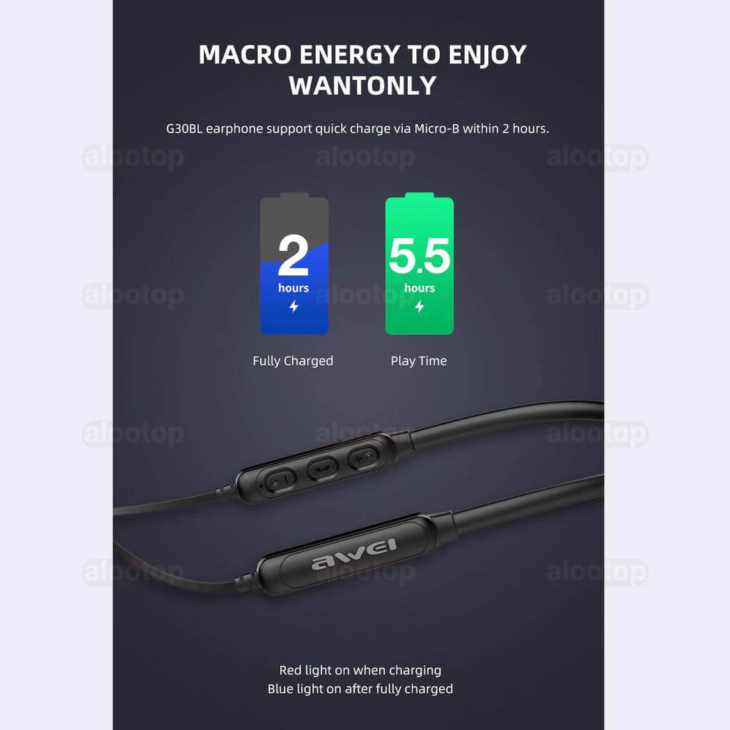نگهدارنده گردنی این هدفون، انعطافپذیری کامل داشته و خیلی راحت دور گردن قرار میگیرد. نکته قابل توجه، وزن تنها 25 گرمی هدفون بی سیم Awei G30BL است؛ موضوعی که باعث میشود حتی در استفادههای طولانیمدت هم به هیچوجه احساس خستگی نکنید.